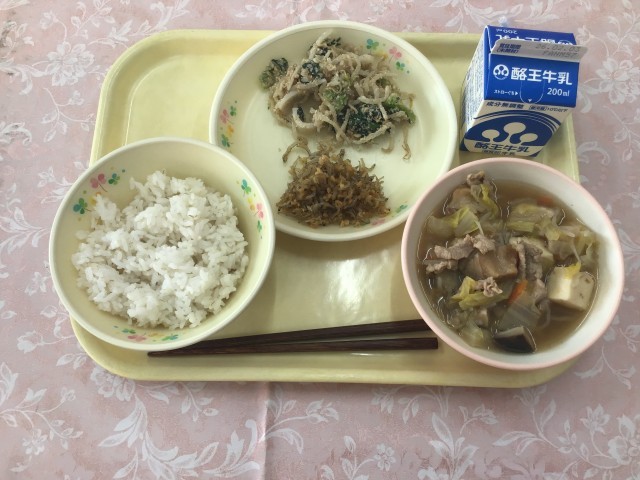 メニューは、麦ご飯、すき焼き煮、ゴマ味噌あえ、チリメンジャコ佃煮、牛乳でした。