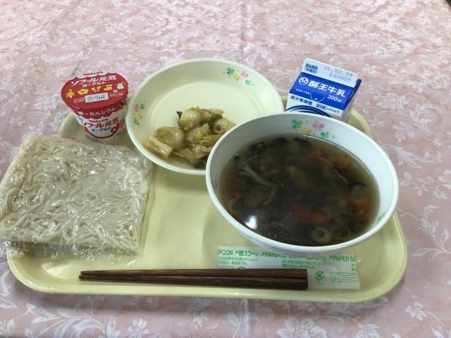 メニューは、ソフト麺、沢煮かけ汁、キャベツもち、ヨーグルト、牛乳でした。