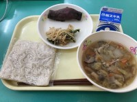 給食は「豆ごはん」「いわしのごまホイル」「三色おひたし」「南蛮汁」