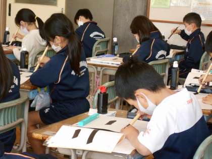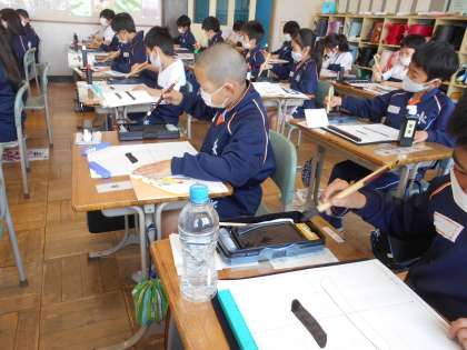 先生の掛け声に合わせて、筆の入りや止めの筆づかいを試します。