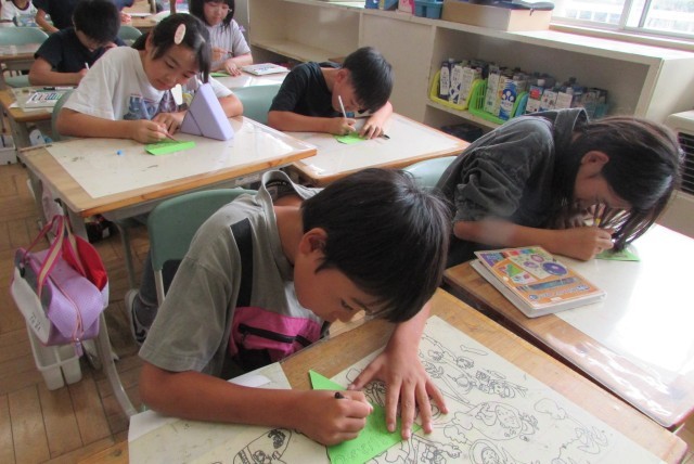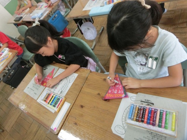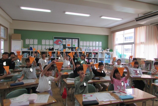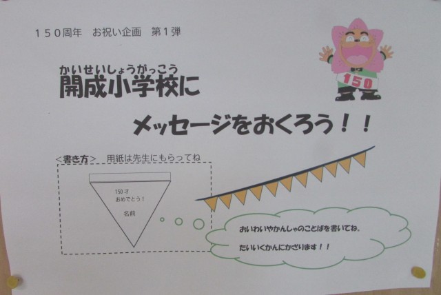 創立150周年記念式典を来週に控え、本格的に準備に入りました。まずは、お祝い企画第1弾「開成小学校にメッセージをおくろう!」。各学年に割り振られた色(虹色になっています!)の三角の用紙に、開成小学校への感謝の気持ちやお祝いの気持ちを書く、というものです。1年生も、心をこめて一生懸命書いていました。できあがったものは体育館に飾り、式典に花を添えます。