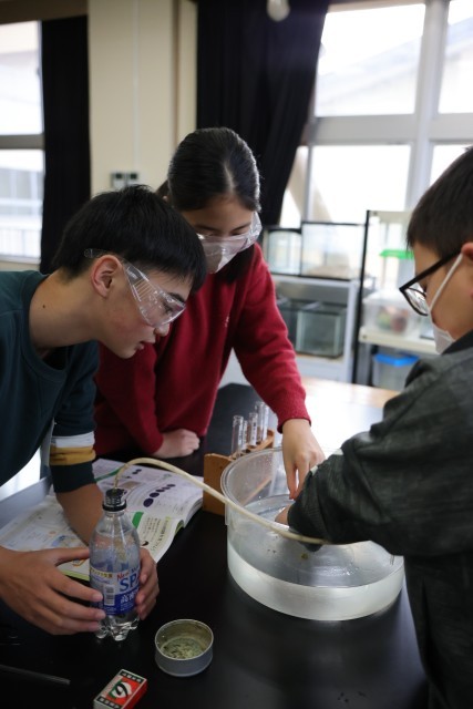 今日は、炭酸水に溶けている物質が二酸化炭素であるということを確かめるべく、炭酸水と石灰水を混ぜて色の変化を見たり、炭酸水から出る気泡を水上置換で試験管内に集め、火のついた線香を入れて経過を観察したりしました。