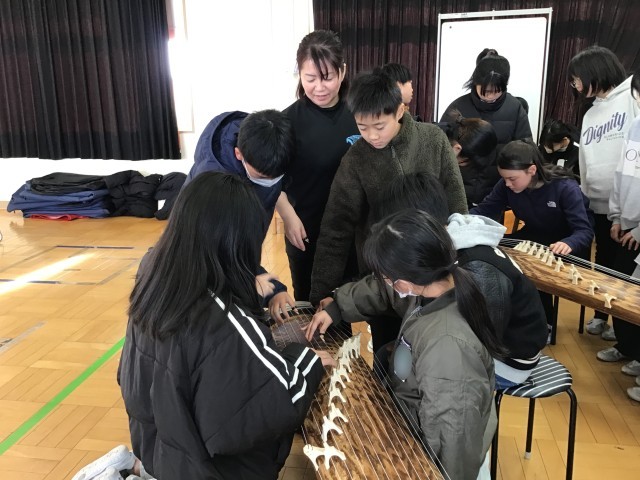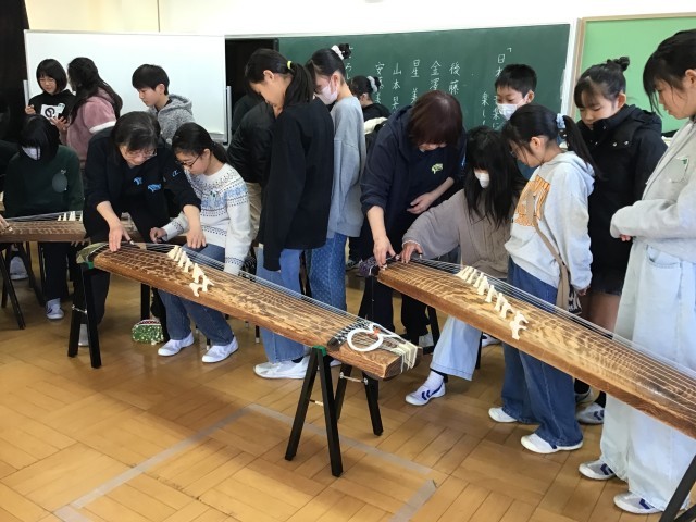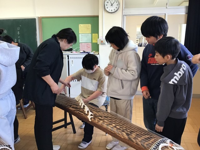 音楽の授業で、地域の先生に来ていただき、箏の体験をしました。
