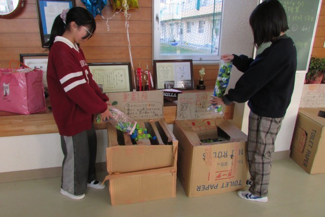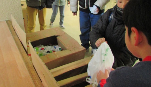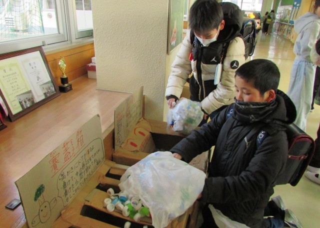 環境委員会主催のペットボトルキャップを集める活動(後期2回目)がスタートしました。昇降口には、ペットボトルキャップを回収する巨大段ボール箱が設置されています。賽銭箱風にアレンジされた箱、さらには、中の様子が見えるように窓がつけられた箱、キャップを入れるところが巨大な口になっている箱の計3種類。協力してくれる友達に、より楽しんで、回収箱に入れてもらいたいという思いから、環境委員会の子どもたちが工夫したものです。キャップは、約800個で一人分のワクチンの寄付ができ、世界中の子どもたちに届けることができるそうです。誰かの役に立つってすばらしい!今後もご協力よろしくお願いします。