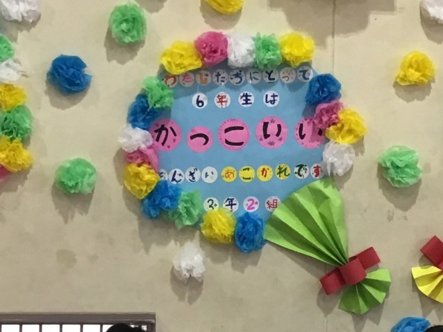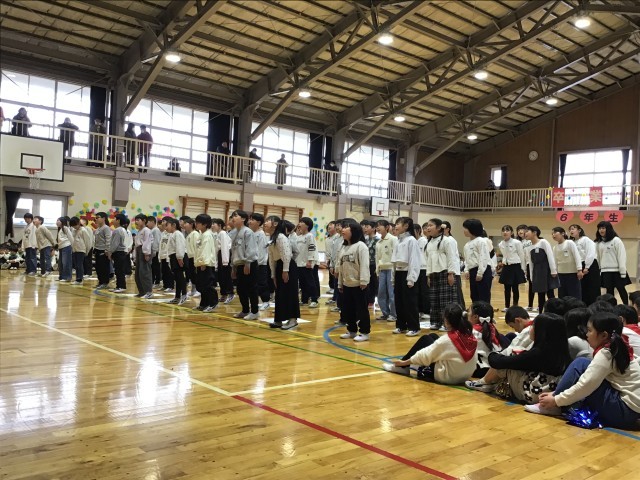 本日(3/3)、6年生を送る会送る会が行われました。3年生は、6年生の先生方に事前に子供の頃の遊びや特技などいくつか質問して、それをクイズとして6年生のみなさんに出しました。担任の先生方のことを知れて、6年生は盛り上がっていました。クイズの最後は、3年生にとっての6年生はどんな存在?でした。答えは、たよれる存在、かっこいい存在、やさしい存在です。6年生へのメッセージにも載せました。クイズが終わると、上白石萌音さんの「なつかしい未来」を心を込めて歌い、6年生へ感謝の気持ちを伝えました。しっとりときれいに歌い上げることができ、6年生も感動してしていました。素晴らしい発表ができ、教室に戻った子供たちは、とてもきらきら輝いていました。保護者の皆様には、子どもたちの服装など準備にご協力いただきありがとうございました。