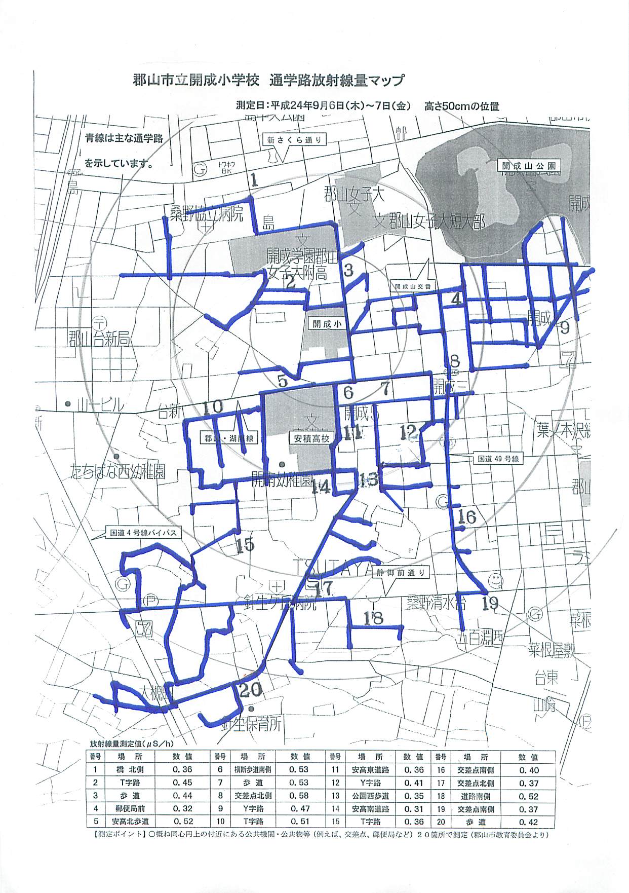 「おしらせ」に掲載していました「通学路放射線マップ」を更新しました。学区内の20箇所の放射線量を測定しました。通学路放射線マップ