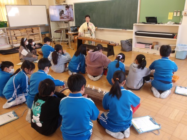 音楽の授業で、地域の先生に来ていただき、箏の体験をしました。「ゲゲゲの鬼太郎」や「トトロ」などの演奏をしていただいたり、クイズ形式で箏について教えていただいたりして、伝統的な楽器について知ることができ...