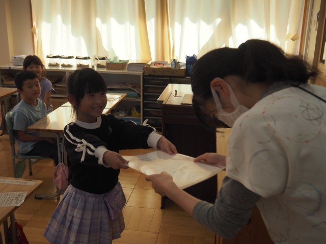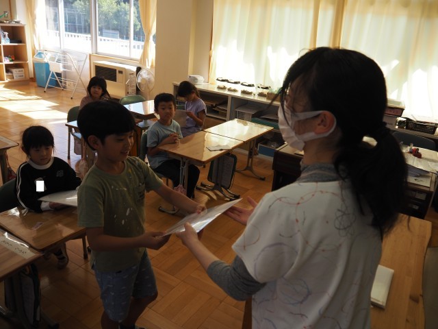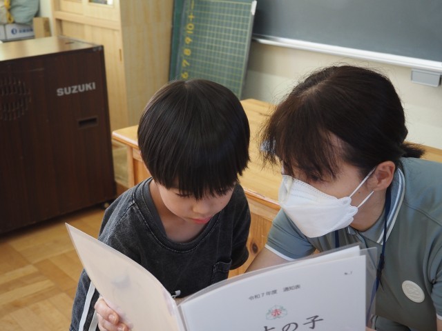 今日で前期が終了となり、一人一人に通知表が配付されました。1年生にとっては、初めての通知表。みんな自分の順番が来るのをドキドキして待っていました。担任の先生から配付された後、うれしそうに通知表を見ている姿が印象的でした。