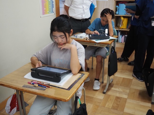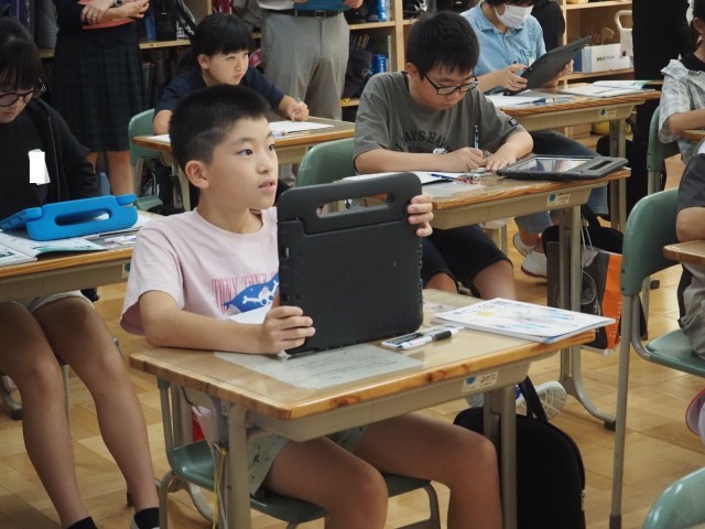 5年2組は、外部から講師の先生をお招きし、算数「分数のたし算とひき算」の単元で研究授業を行いました。今日は、分母の違う分数の計算の仕方を考える学習です。タブレットを使い数直線をヒントに課題解決に臨みました。