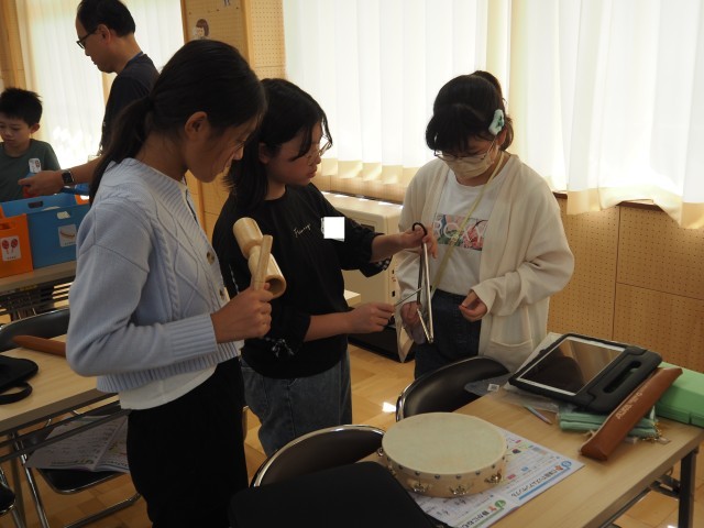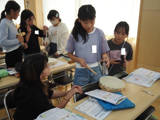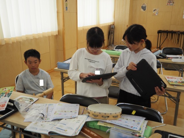 5年1組は、音楽で打楽器でのリズムアンサンブルの練習をしていました。楽器を分担しながら、実際にリズム打ちをしできばえを話し合い修正を加え、改善を図っていました。
