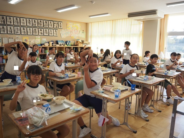 今日の給食は、お月見スープ、枝豆入りおひたし、きのこごはん、お月見団子、牛乳で「お月見献立」となっていました。