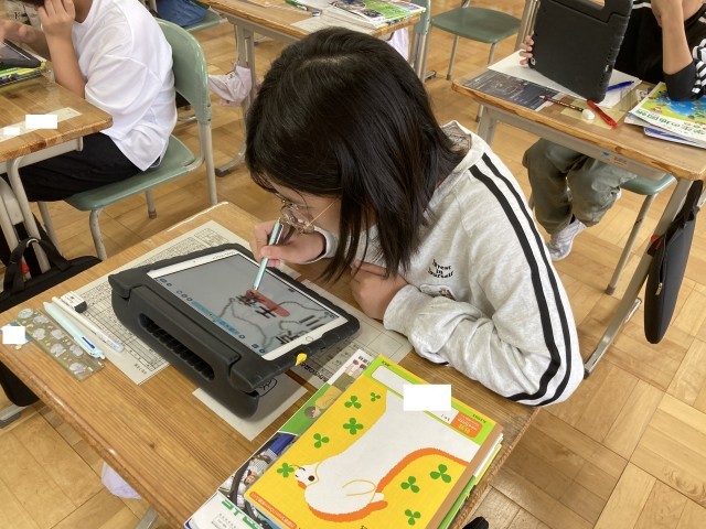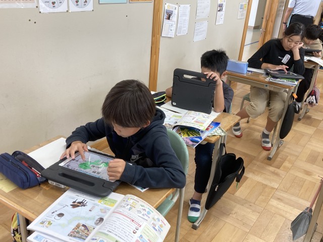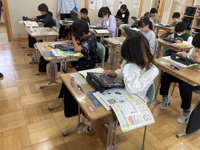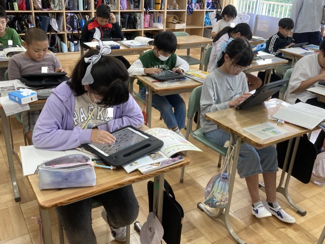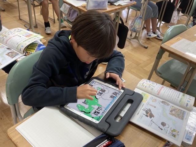 タブレットを活用し、地域別統計表から事業者数、従業員数、出荷額が多い都道府県を探し、地図に色を塗っていきました。集中して作業を行っていました。