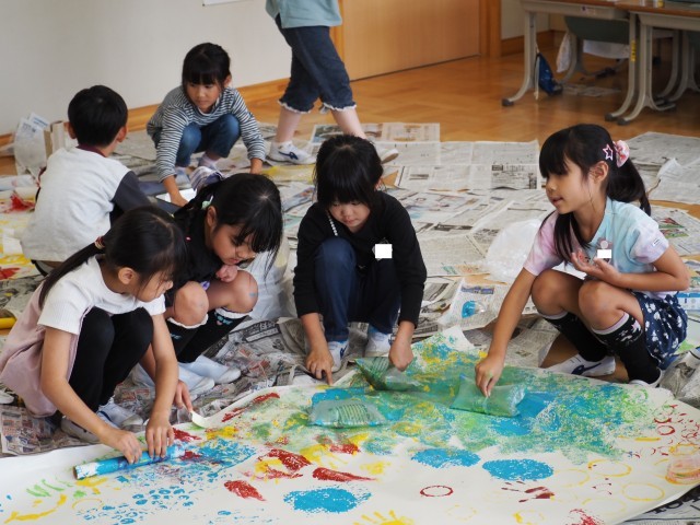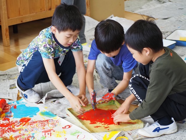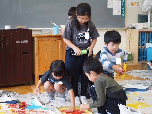 グループのお友達と協力しながら、お気に入りの色や材料を使って模造紙に模様をつけていきます。みんな生き生きと活動していました。