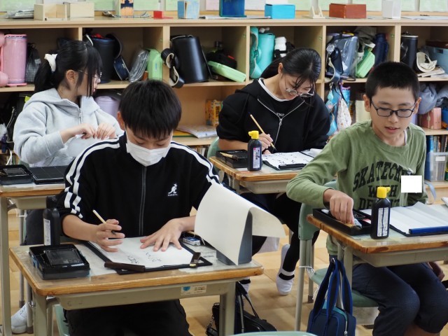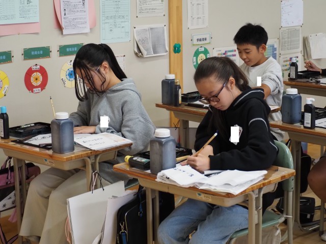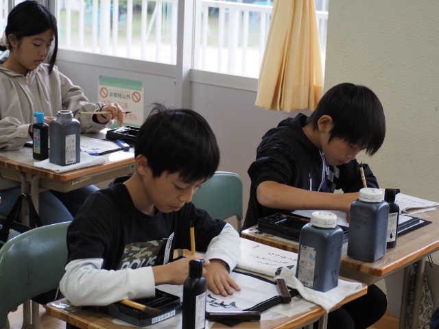 6年2組は、書写で「用紙にあった文字の大きさと配列」の学習を行っていました。習字の半紙に、小林一茶の俳句「名月を 取つてくれろと 泣く子かな」をバランスよく書く練習をしていました。いつもの習字の文字とは違うため、少し苦労しているようでした。