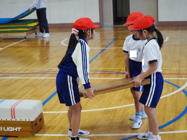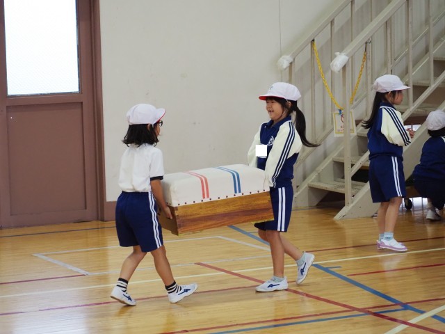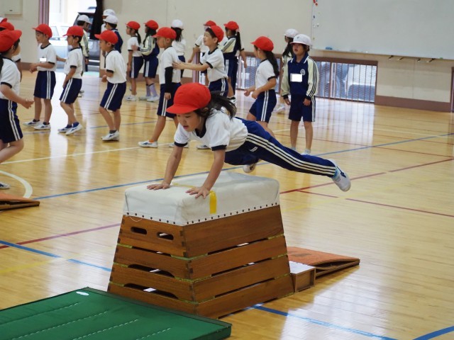 1年生は、体育で「跳び箱あそび」を行っていました。準備された1段から4段の跳び箱を使って、開脚跳びに挑戦していました。少しずつコツをつかみ上手に跳ぶことができるお友達が増えました。準備や片付けも友達と協力し、頑張っていました。