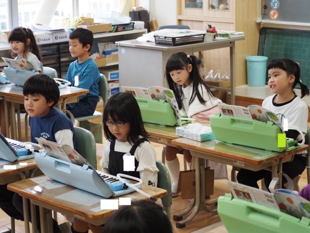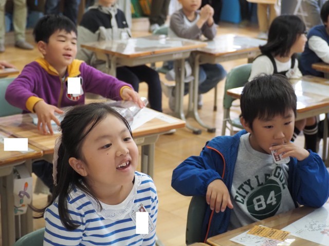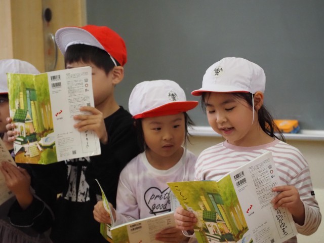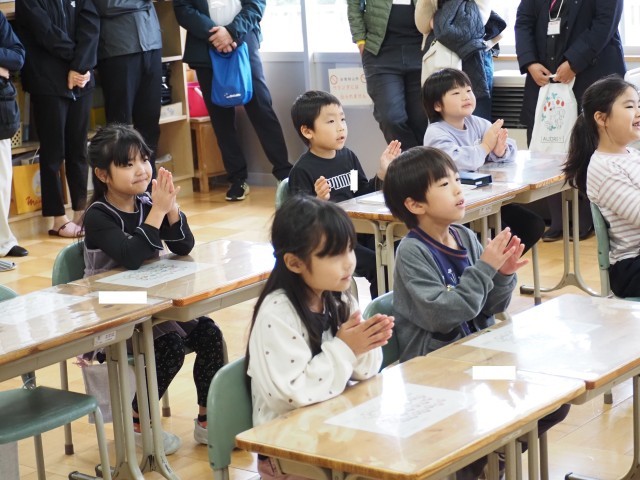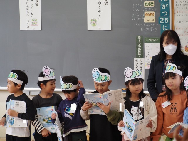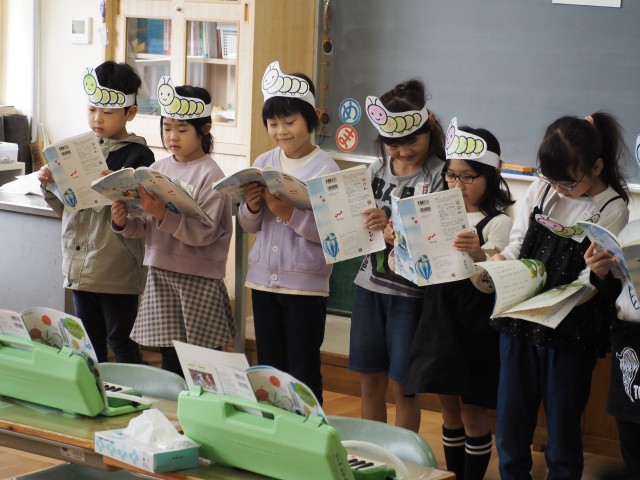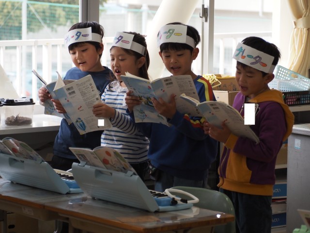 赤木の日 学びの発表会、初めて参加した1年生、音読や歌やリズム遊びを元気に発表しました。