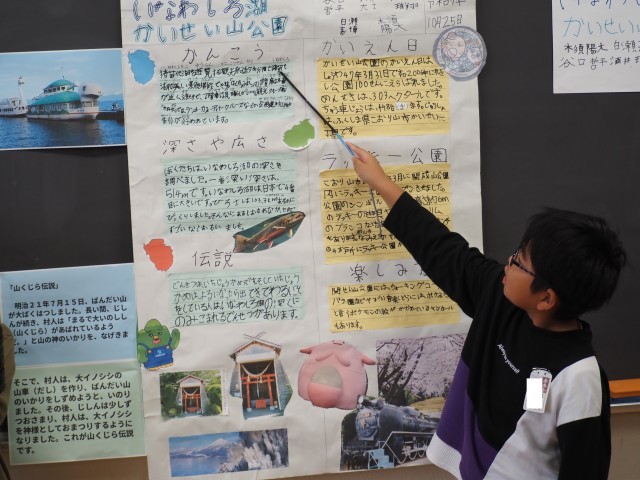 3年生は、「郡山のすてきを見つけよう!」の発表です。テーマによりグループを作成し、調べたことを模造紙にまとめました。たくさんの郡山の素敵を発見し、みんなに伝えてくれました。