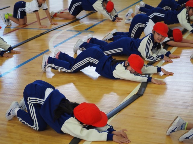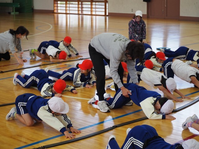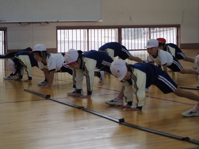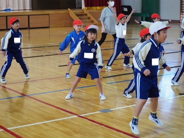 1年生は、講師の先生をお招きし、リズムトレーニングの学習を行いました。音楽に合わせてたくさんの動きを教えていただきました。