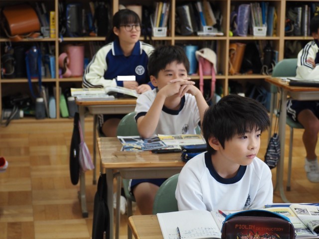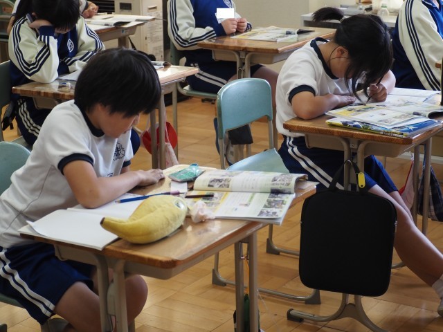 5年2組は、社会で「自動車工場では何をつくっているか」を考えていました。教科書を見たり、日産工場を見学した際のことを思い出したりしながら考えをまとめていました。
