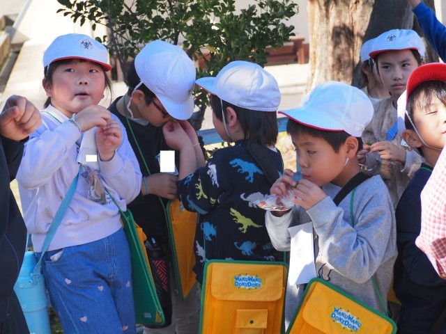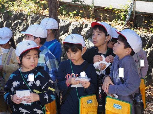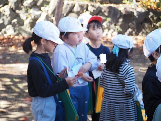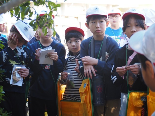 葉っぱの匂いをかいでみたり、落ち葉を拾ってしっかり観察したりしました。詳しく植物について案内人から説明いただき、新しい発見をたくさんしたようでした。