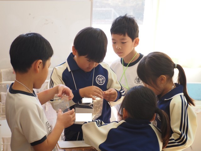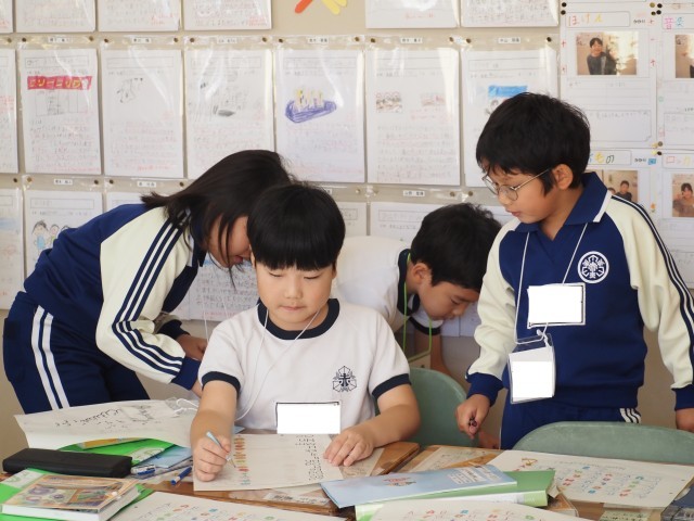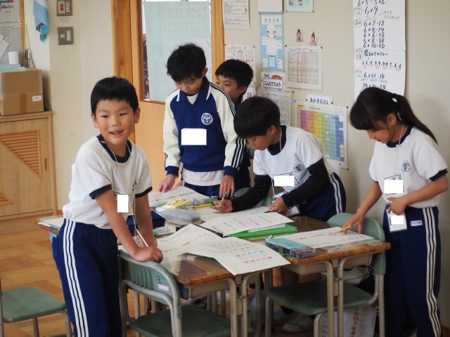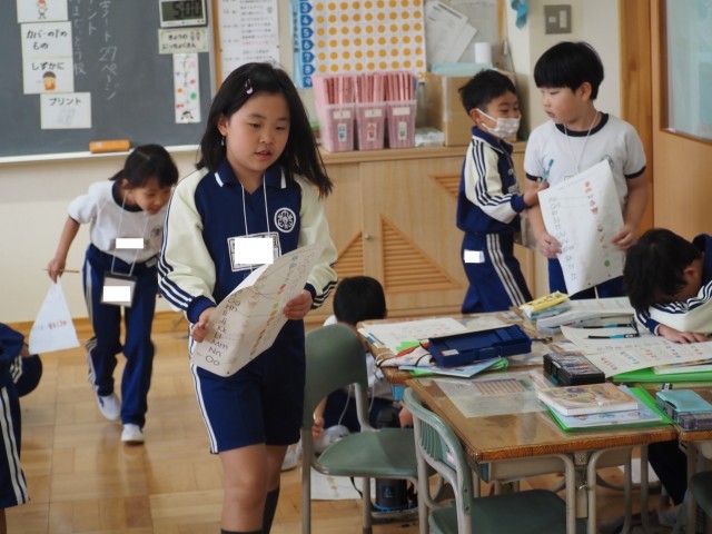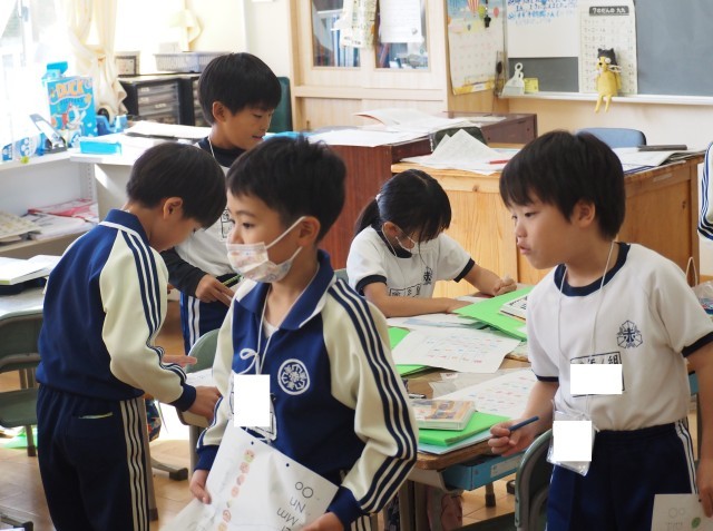2年1組は、ジリアン先生との英語表現科の学習です。今日もアルファベットの学習をしました。視写をしたり、発音をしたりした後に、教室の隠されたアルファベットカードを探す活動を通して、アルファベットに親しんでいました。隠されたカードを一生懸命探しだそうと頑張っていました。