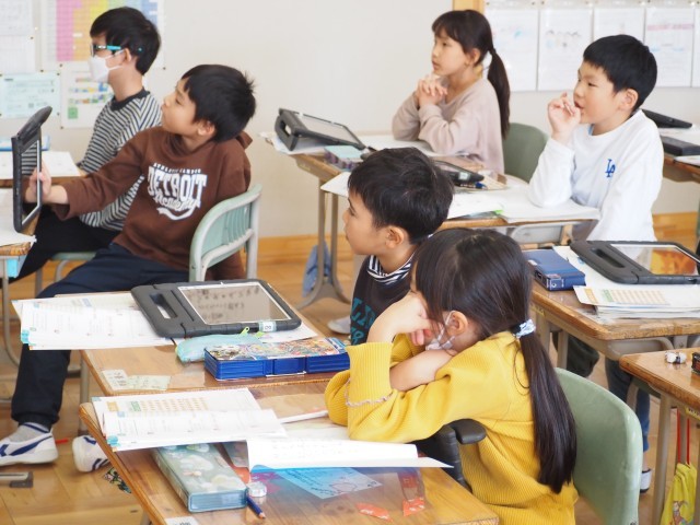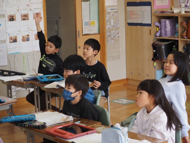 2年1組は、算数で「かけ算」の学習を行っていました。今日は、九の段の秘密を探していました。見つけた秘密を大型テレビを使って発表していました。