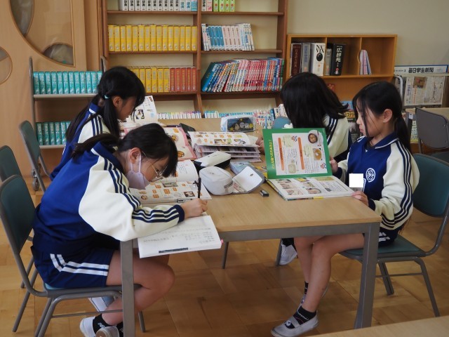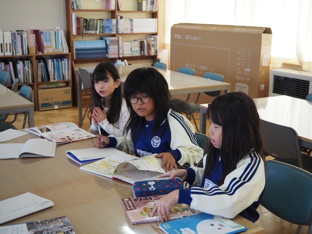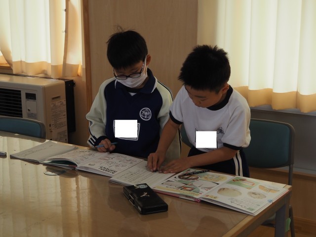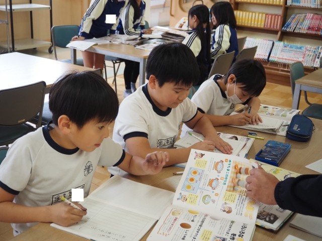 3年2組は、国語で「食べ物の秘密を教えます」の学習を行っていました。「すがたを変える大豆」の学習が終わり、大豆とは違う食べ物について、本を活用して秘密を見つけ出し、友達に伝える学習です。自分の好きな食べ物を選び、さっそく調べ学習に励んでいました。