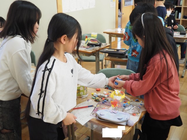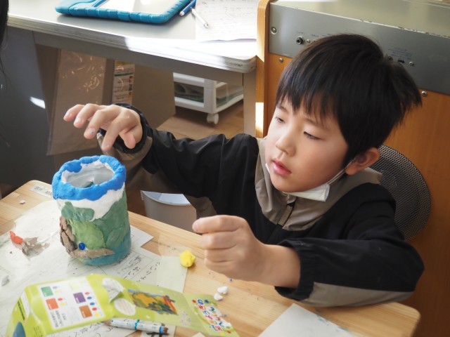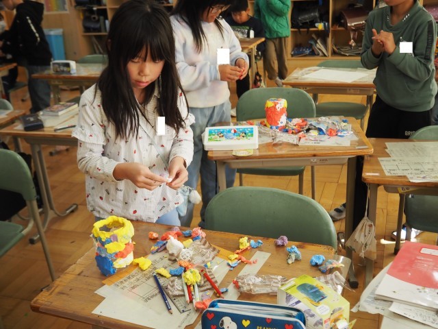 3年2組は、図画工作で「空きようきのへんしん」の製作を行っていました。空き容器に紙粘土で飾りをつけ、思い思いの容器に変身させていました。色とりどりの紙粘土が容器の周りに取り付けられ、カラフルな容器への姿を変えていました。