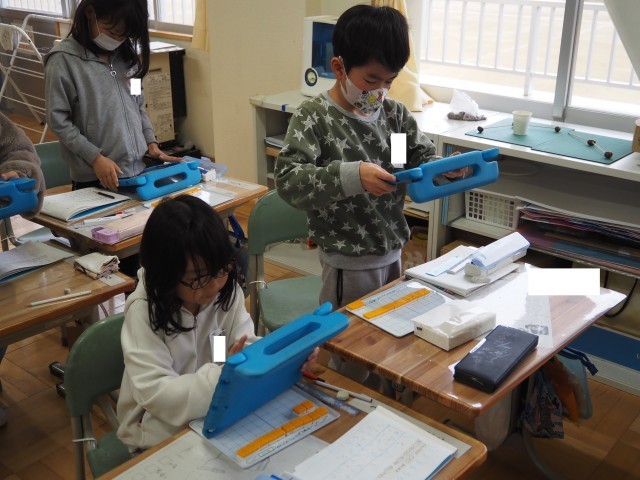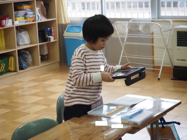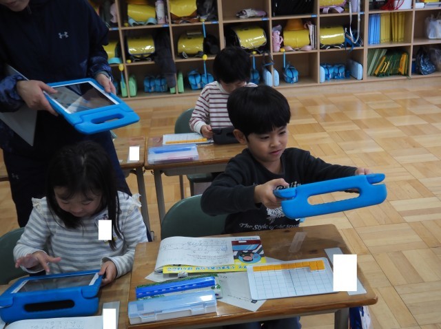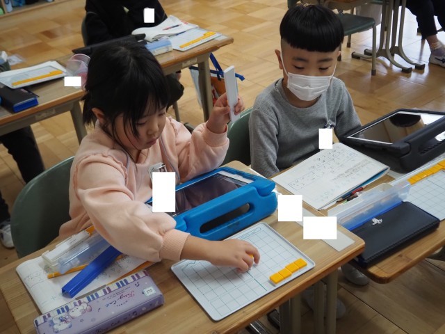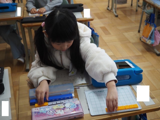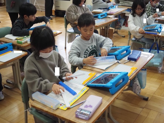 1年2組は、算数「ひき算」で研究授業が行われました。今日は、12-3の計算の仕方について学習しました。はじめに10から7を引き2を加える方法と3を2と1に分け12から2を引き10とし、その10から1を引く方法をブロックを操作しながら考え出していました。その後、自分の考えをタブレットで撮影し、みんなに情報を送り共有していました。タブレットの操作もスムーズに行っていました。
