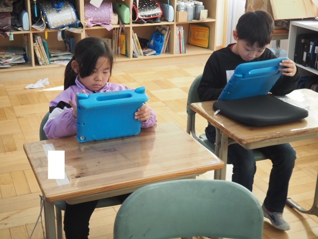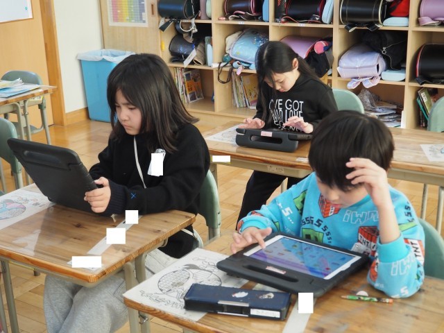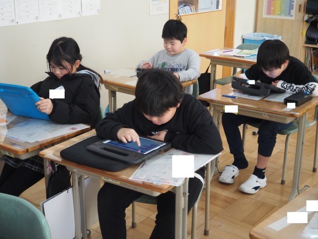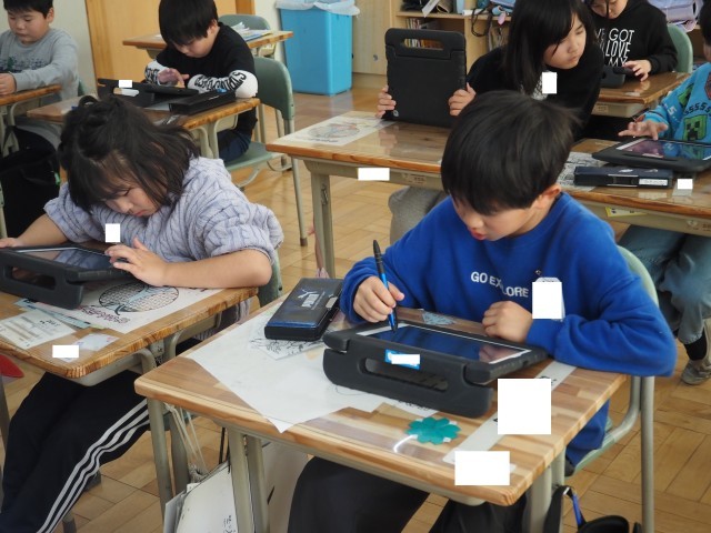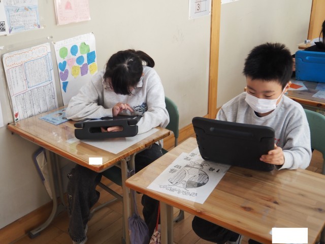 3年2組は、プログラミング学習を行っていました。今日は、スクラッチを使って、好きなことをを伝えるプログラム作成を行っていました。画面を真剣に見ながら、集中して活動に取り組んでいました。