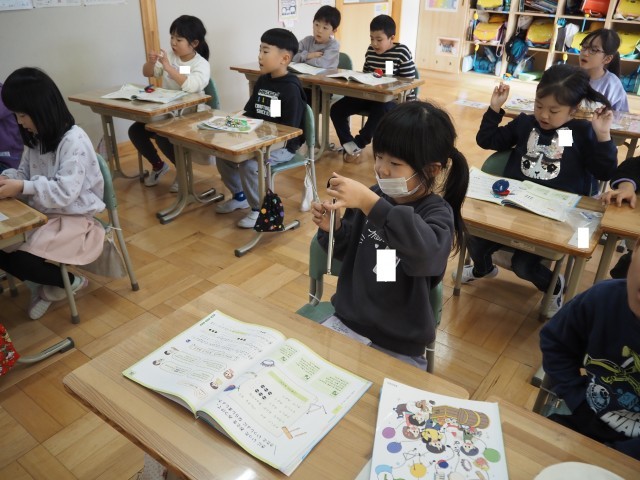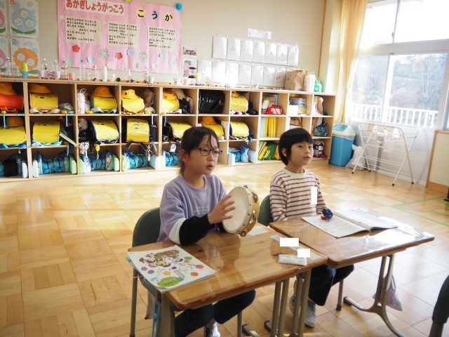 1年2組も、1組同様、音楽で「さがしてみよう ならしてみよう」の学習を行っていました。友達と交換しながら、たくさんの楽器に触れていました。