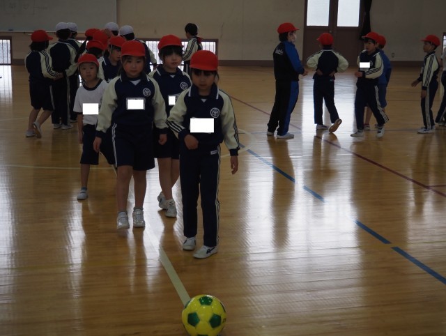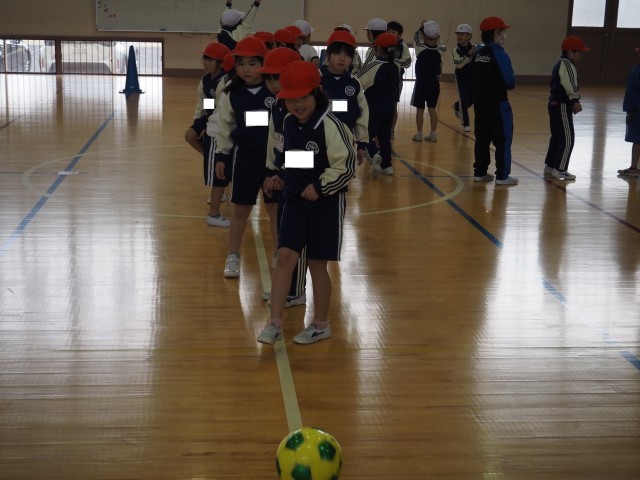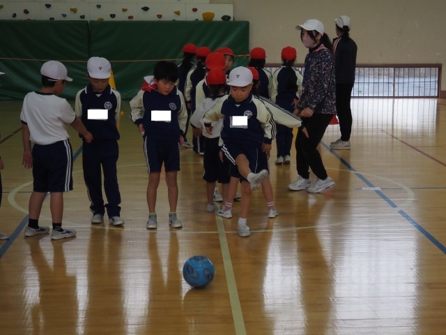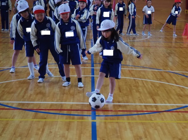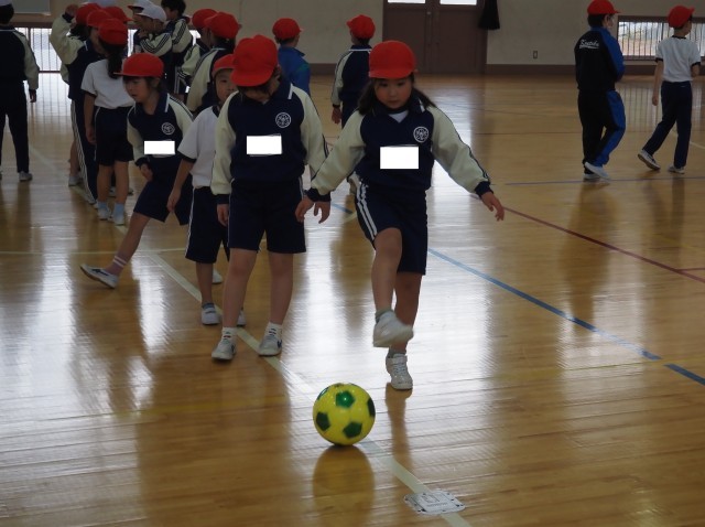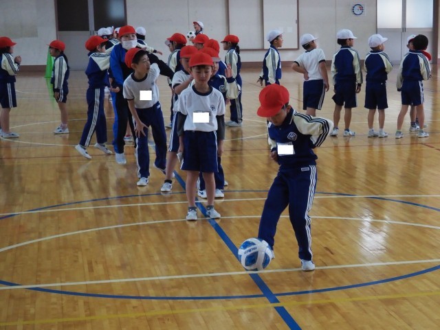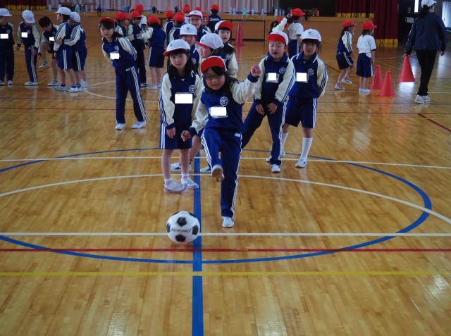 1年生は、体育で「ボールけりゲーム」を行っていました。目標物のコーンの間を通そうとよく狙って慎重にボールをけっていました。