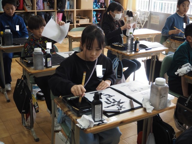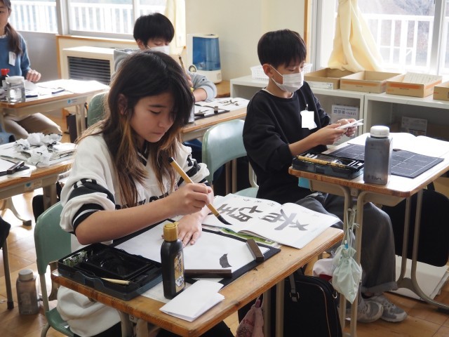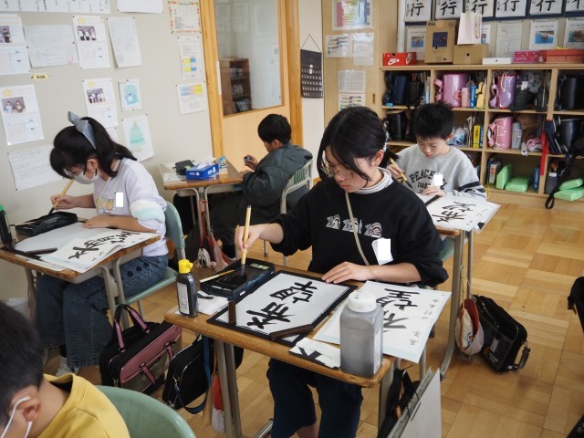 5年1組は、書写の時間に毛筆で「希望」を書いていました。姿勢を正し、手本をよく見ながら丁寧に筆を動かしていました。