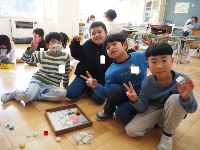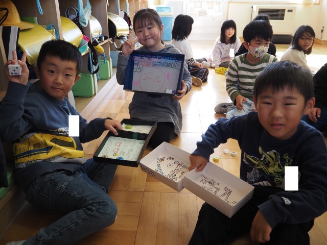 1年2組も図画工作で「おはなしすごろく」を製作しました。ゲーム機器が盛んに使われる中、自分たちで作ってみんなで楽しむ活動も大切にしていきたいですね。1・2組ともに笑顔で楽しんでいました。