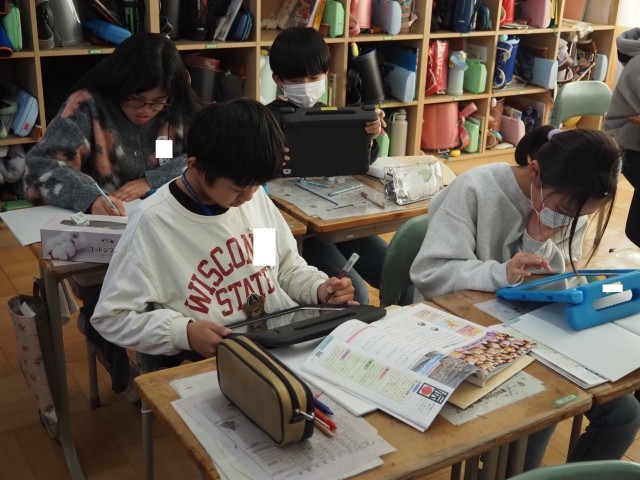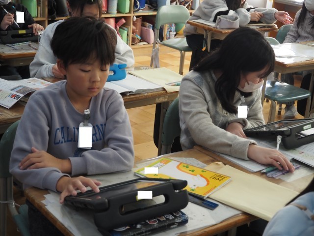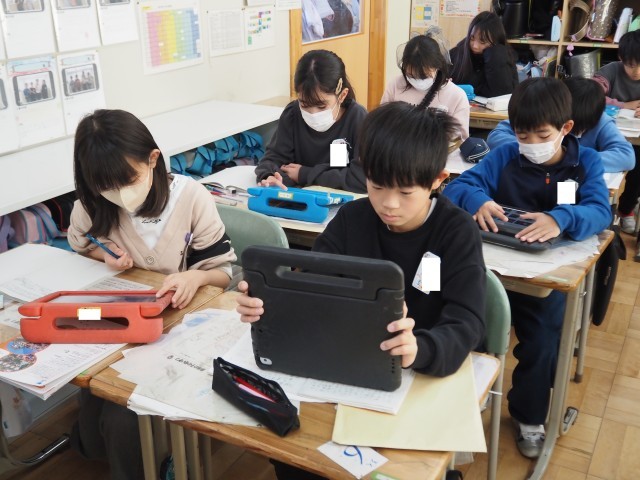 4年1組は、社会で「残したいもの 伝えたいもの」の学習を行っていました。今日は、福島県の伝統工芸品について調べていました。タブレットを活用し、集中して県内の伝統工芸品を調べていました。