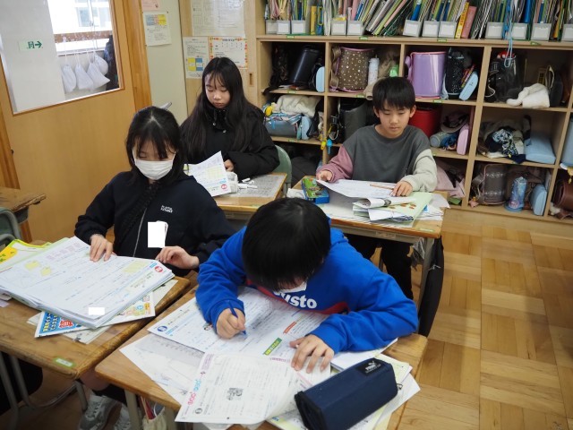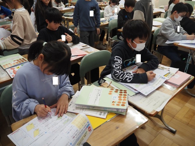 4年1組は、テストが返され学習の振り返りを行っていました。間違った個所を修正し、次の学習に生かそうと頑張っていました。2学期も残りわずかです、これまでの学習の反省をしましょう。学習は、積み重ねが大切です。