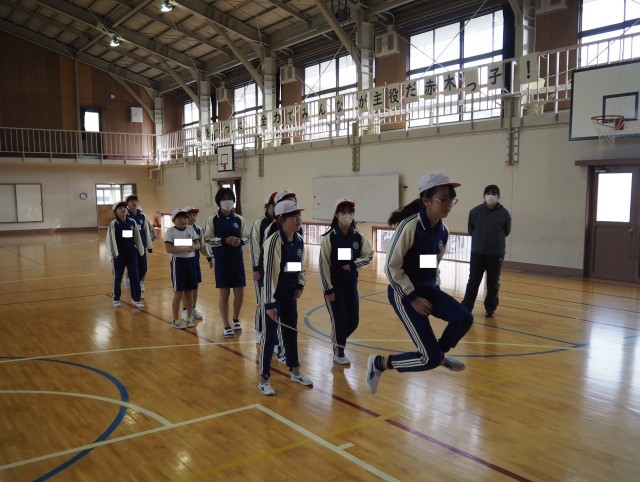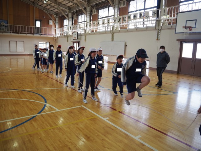 3分間で何回跳べるか競います。タイミングよく跳び、記録の更新を目指しましょう。そのためにも、みんなで協力し、心を一つにすることが大切ですね。