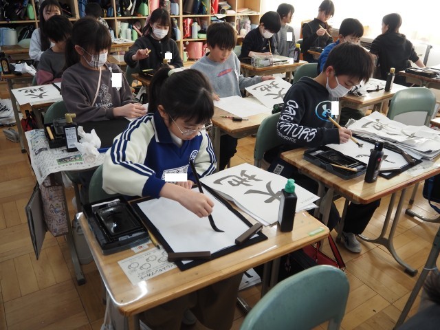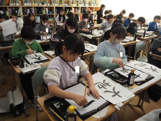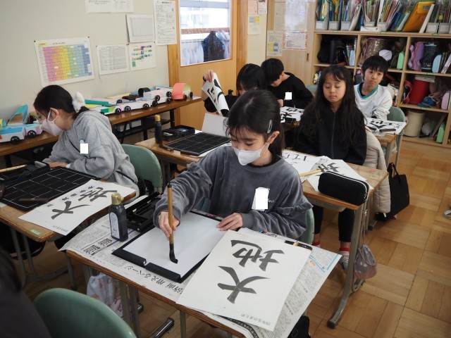 4年生は、書写の学習を行っていました。今日は毛筆で「大地」を書きました。漢字2字のバランスをとるとともに、左右の払い、曲がり、はねの書き方のまとめとなる文字です。みんな手本を見ながら、丁寧に書いていました。