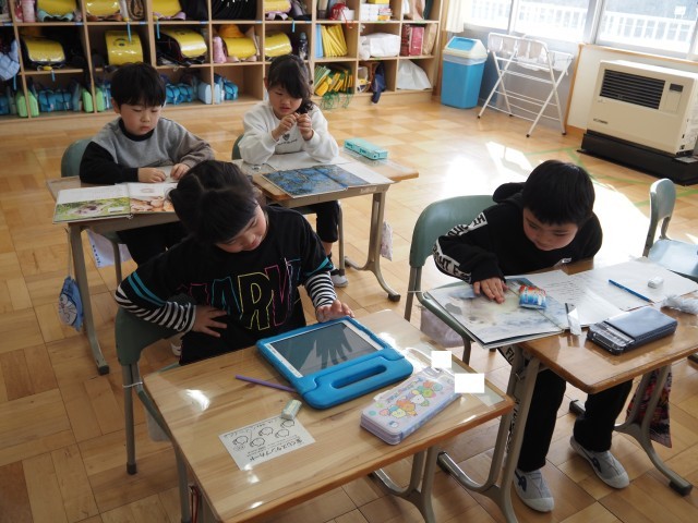 1年2組は、国語で「どうぶつの赤ちゃん」の学習を行っていました。教科書に書かれていない動物の赤ちゃんの様子を図鑑やタブレットを使って調べ、学習カードにまとめていました。