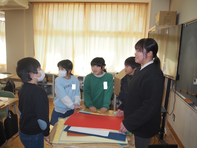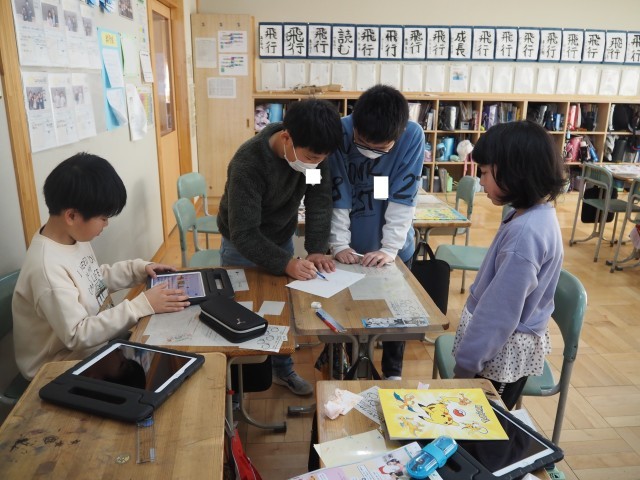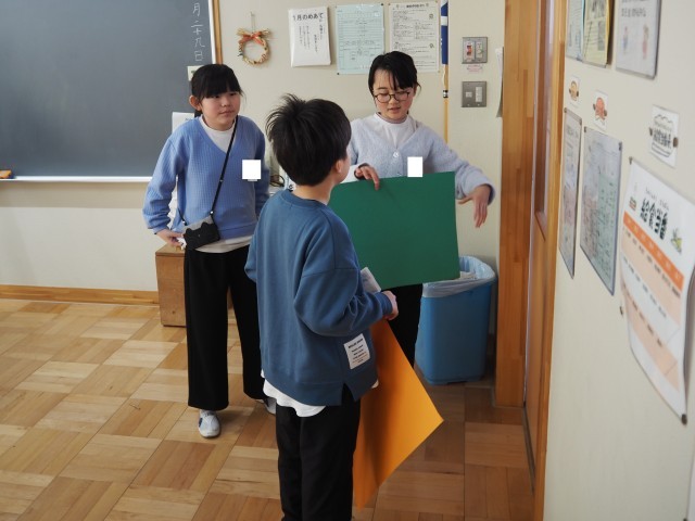 5年2組は、図画工作で「笑顔が生まれるしかけ」の学習を行っていました。班の友達と協力し、学校の中にちょっとした笑顔が生まれるしかけを考え飾りつけします。今日は、アイディアを出し合い、構想を練っていました。