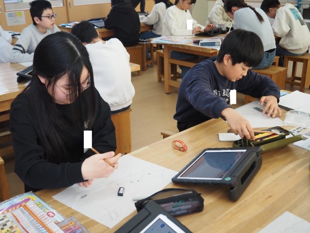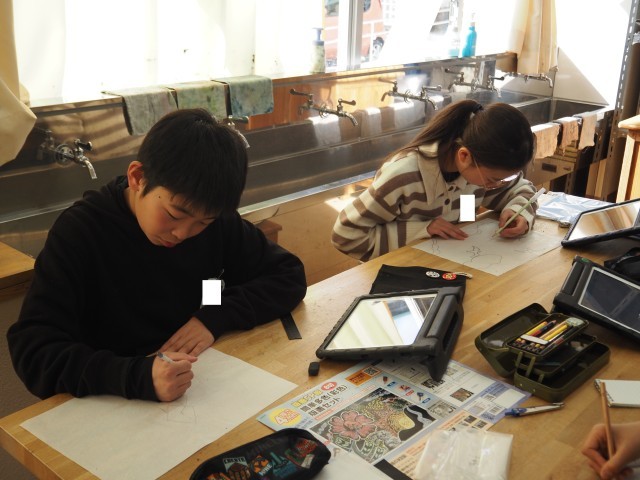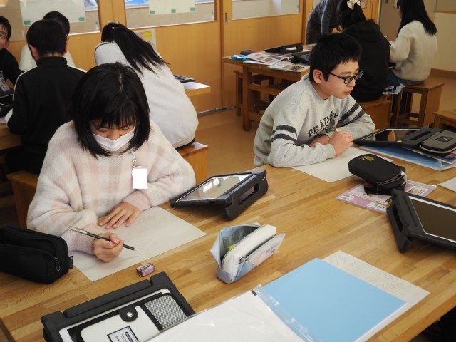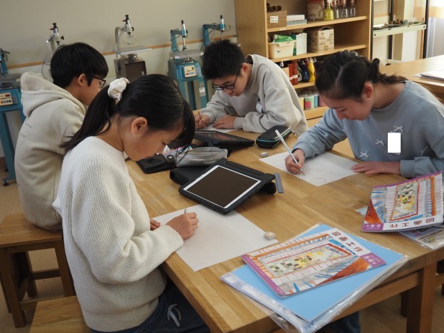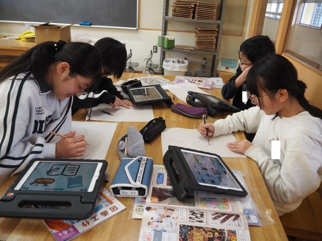6年2組は、図画工作で「版で広がるわたしの思い」の制作活動を行っていました。今日は、版に表す下描きをしていました。何を描くかかなかなか決まらず、悩んでいる様子が見られました。