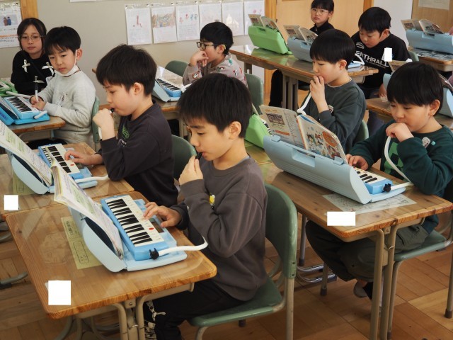 2年2組は、音楽で鍵盤ハーモニカの練習をしていました。今日は、「こぐまの二月」を演奏していました。少し速いテンポの曲ですが、指番号を意識しながら丁寧に演奏していました。