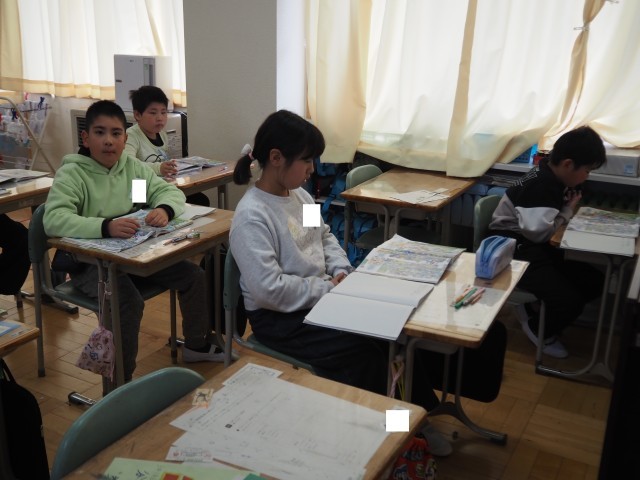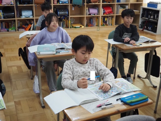 3年1組は、社会で「市の様子と人々にくらしのうつりかわり」について学習していました。教科書の資料を見ながら、市がどのように変化してきたかをみんなで話し合っていました。