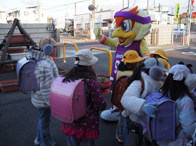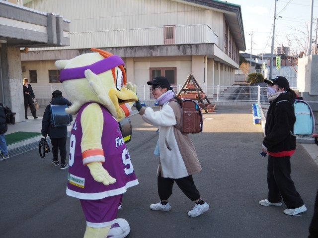 登校の時間に福島ファイヤーボンズのマスコット「ボンズくん」があいさつ運動に来てくれました。突然の来校に子ども達も驚いていたようでしたが、明るい笑顔があふれていました。