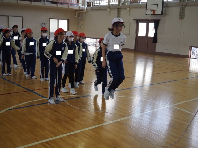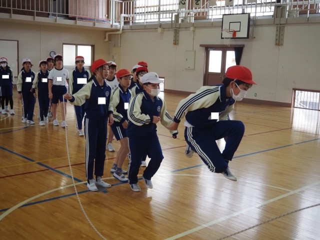 最後の種目は、長縄による八の字跳びです。チームワークを大切にしながら、3分間跳び続けました。クラス記録更新とはなりませんでしたが、心を一つに頑張りました。