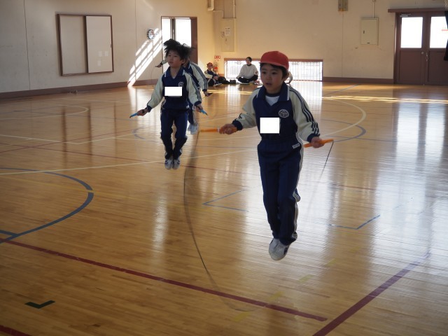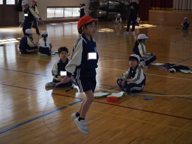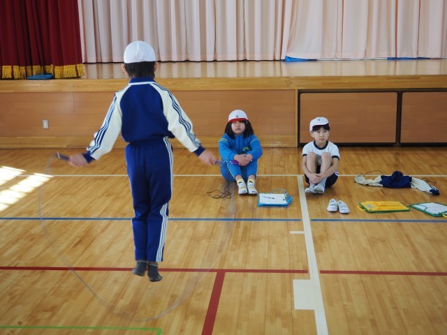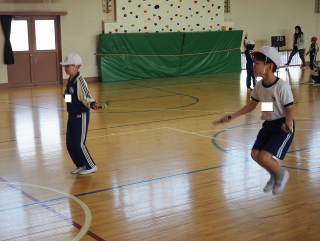 3人でグループを組み、記録会を行いました。友達の跳ぶ様子を見たり、跳んだ回数をしっかり数えたりしていました。写真は、30秒後ろ持久跳びと前かけ足跳びの様子です。前かけ足跳びでは、自己記録を更新する児童が多く見られました。