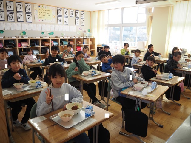 今日の給食は、さつまじる、ヒレカツ、ゆで野菜、ごはん(ソースカツどん)、牛乳で「会津グルメ献立」になっていました。ソースカツどんの歴史は、諸説ありますが、大正時代に誕生したとされています。会津若松市をはじめ、福井県、長野県、群馬県などでもご当地グルメとして愛されています。地域によってカツの暑さ、パン粉の種類、ソースの味付け、付け合わせ(キャベツの有無など)にも違いがあるそうです。給食の様子は、3年生になります。