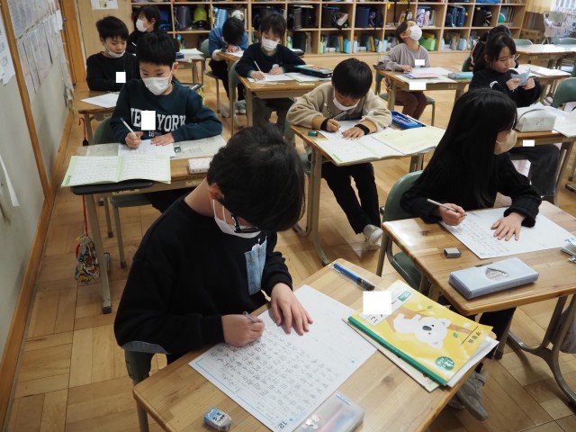 2年1組は、書写で硬筆の学習を行っていました。今日は、2年生で習った漢字を書き出していました。姿勢にも気を付け、丁寧に書いていました。