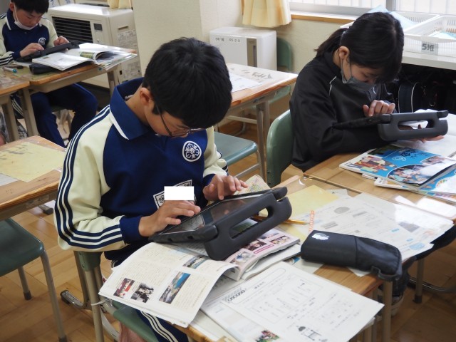 6年1組は、社会の学習を行っていました。今日は、「平和な日本になるまでをたどろう」をテーマに、これまでの歴史の学習で印象に残っている出来事や人物、生活の中の暮らしなどの中から一つを選び、みんなに紹介するため、タブレットを使ってまとめていました。どんなことが印象に残ったのでしょう?
