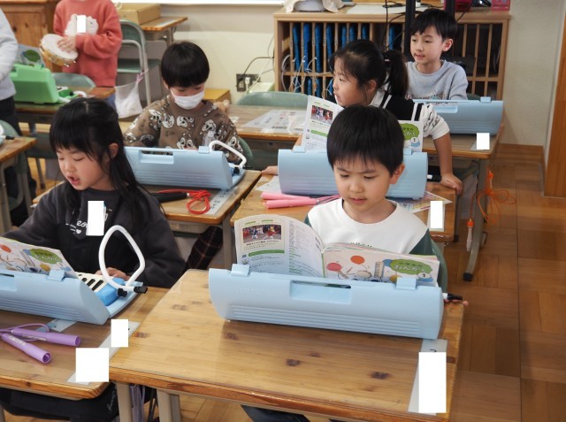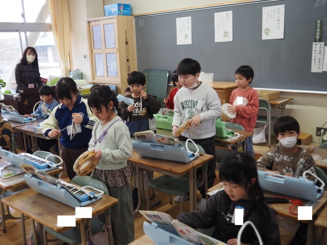 鍵盤ハーモニカ、タンバリン、トライアングルなど、楽譜に合わせて演奏できるようにもなりました。みんな上手に演奏していました。